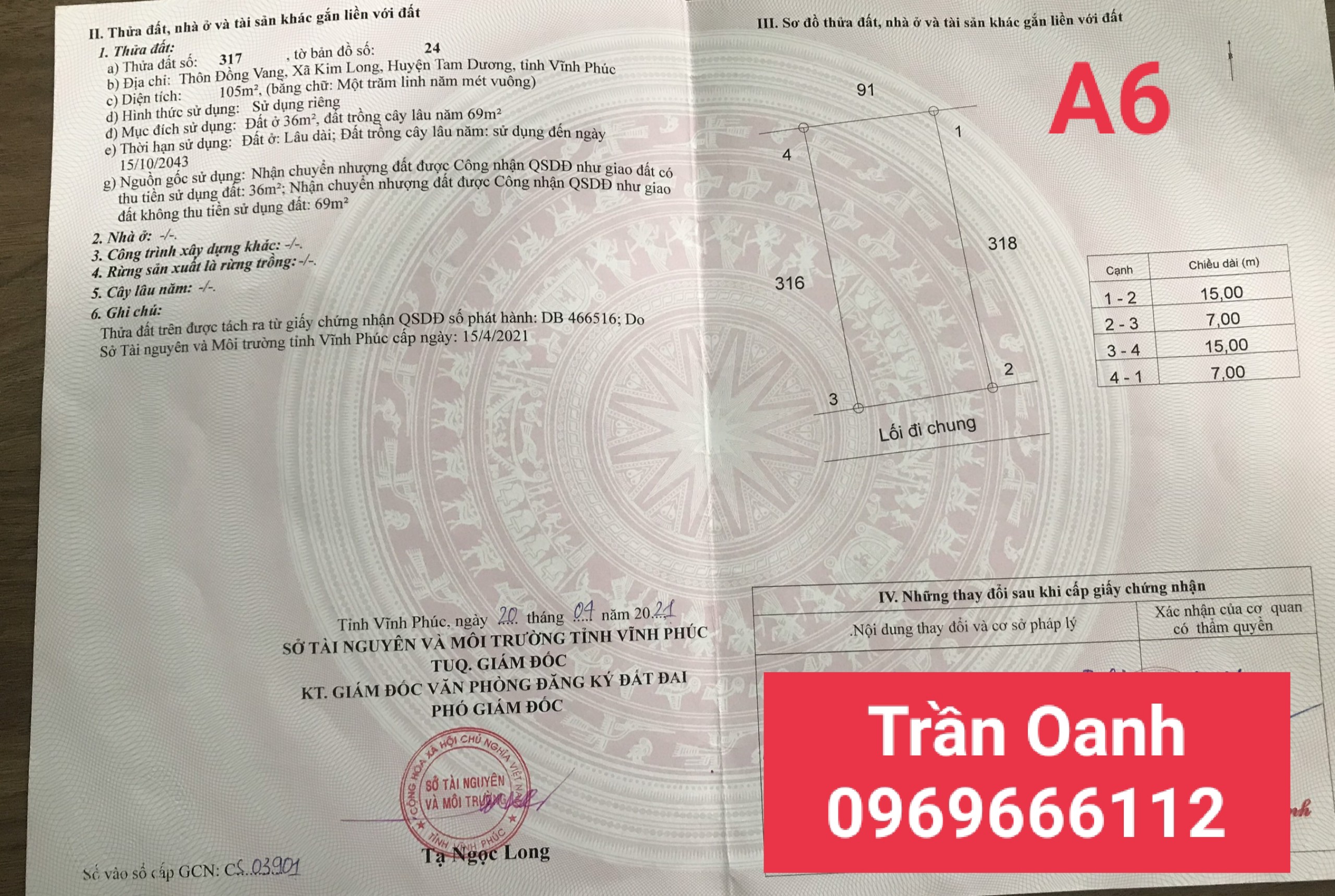 Diện tích: 105 m2 ( thổ cư : 30m2)