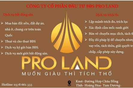 Công ty cổ phần đầu tư BĐS Pro land Địa chỉ: Km6 đường Hợp Châu Đồng Tĩnh- Hoàng Hoa- Tam Dương- Vĩnh Phúc. Hotline: 0378 662 333 ( Ms Quỳnh) Trích.